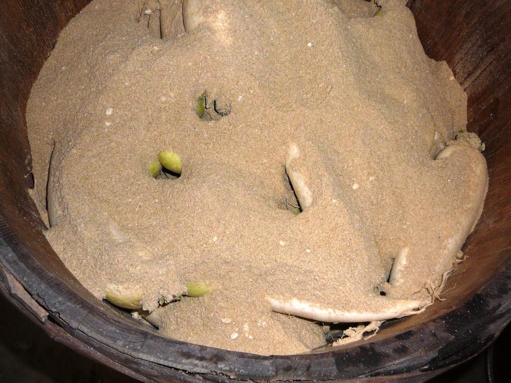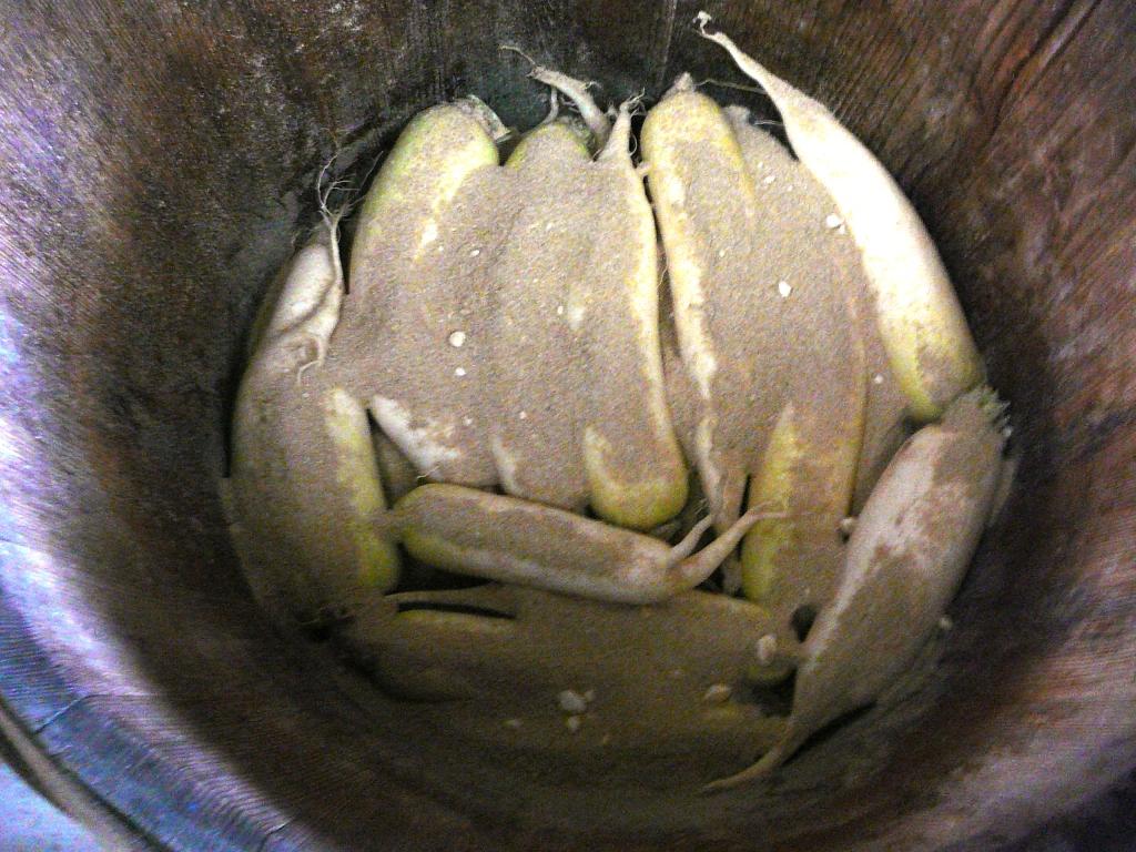 3 樽の一番底に、2の混ぜた糠を敷きその上に大根を1列に縦方向に並べていく。