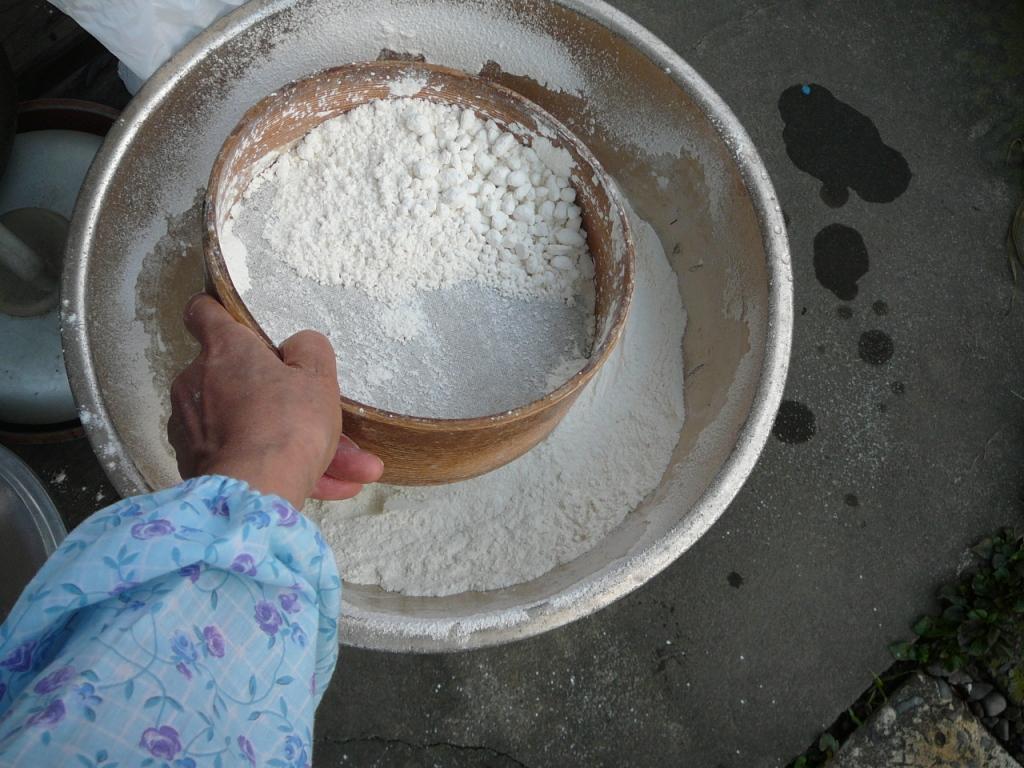 2、小麦粉はよくふるいにかける。たんさんを混ぜてさらにふるいにかける。