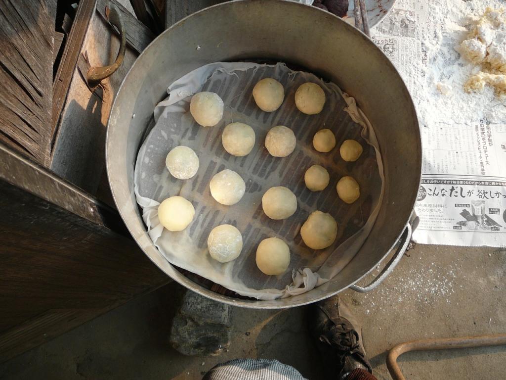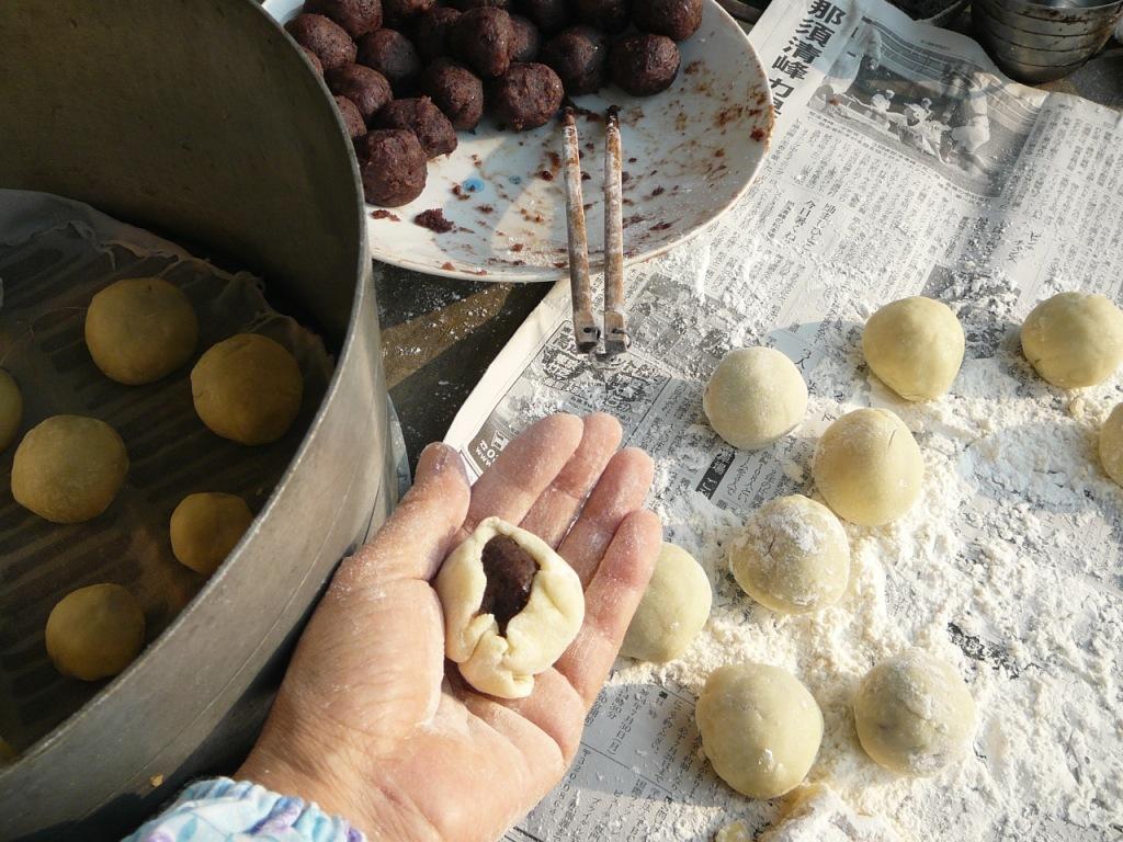 饅頭の粉とタンサンををふるいにかけるはしで耳たぶくらいの硬さに混ぜるあんと同じくらいの大きさに粉をまるめて包むせいろに13個~15個くらい並べるかまどでふかす。(ガスこんろでも良い)饅頭をふかす。(12分~13分)