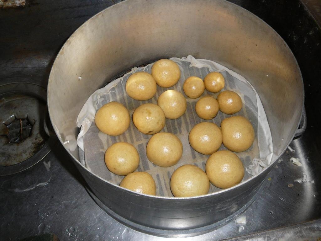 セイロにふかしたあとでまんじゅうが膨らみ、くっつかない程度に並べる。