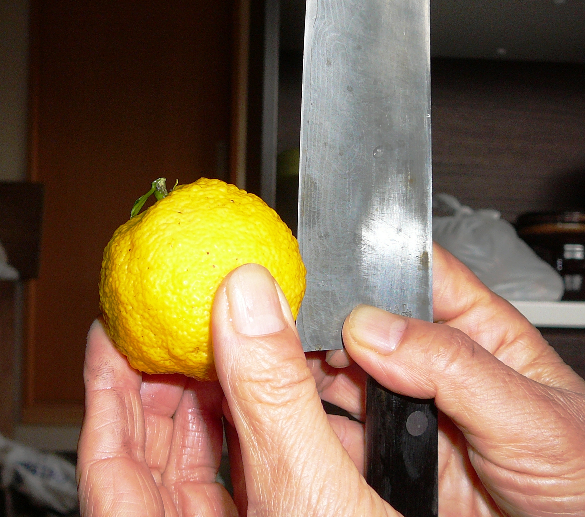 ゆずに包丁で1センチのたての溝を、へたの5つに合わせて刻みいれる。