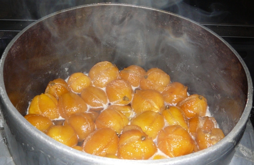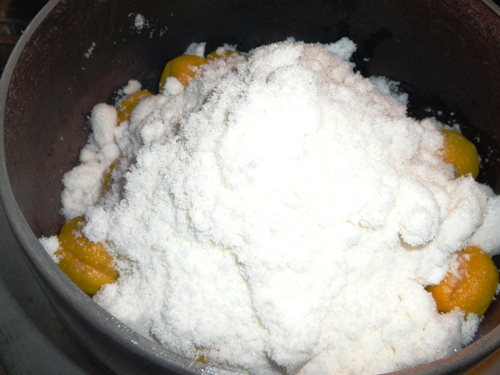 2キログラムのゆずに対して砂糖1キロ 酢を400cc入れて30分間とろ火で煮込む。