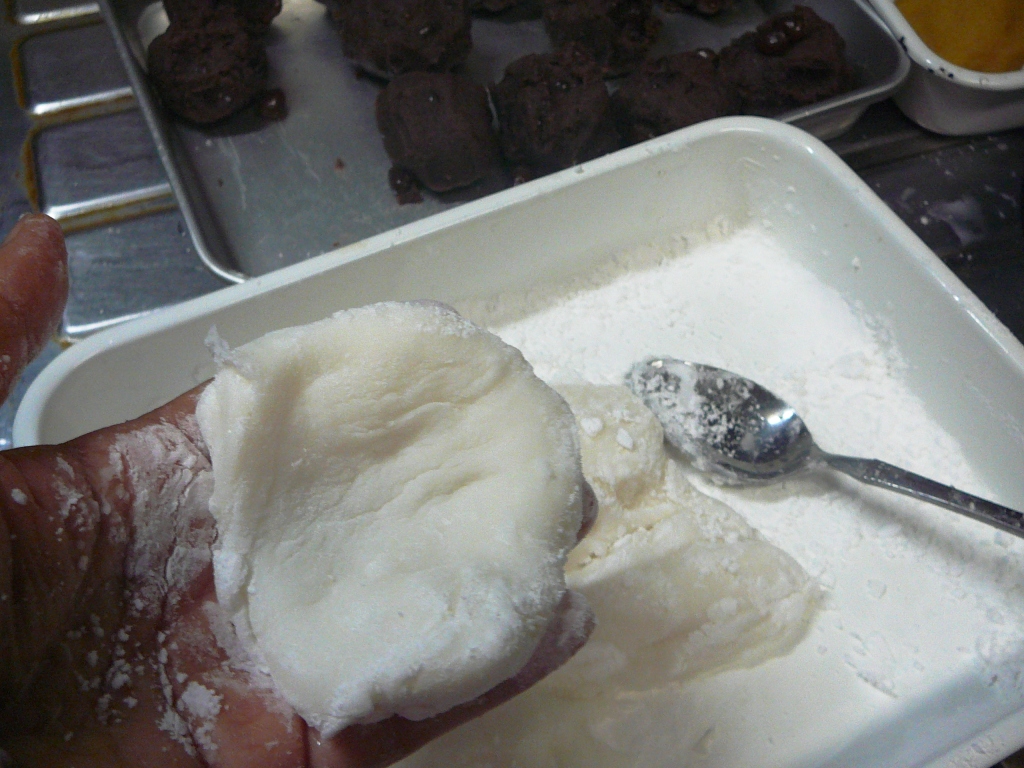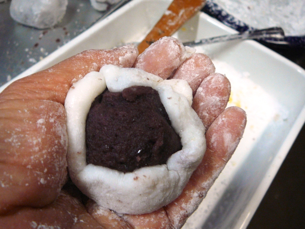 温かいうちに皮を伸ばしてその中にあんを入れて出来上がり。