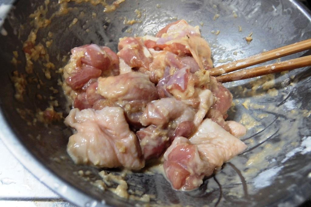 ②生姜 ニンニク 醤油を大さじ1ずつ入れ鶏肉と付け込む。15分位