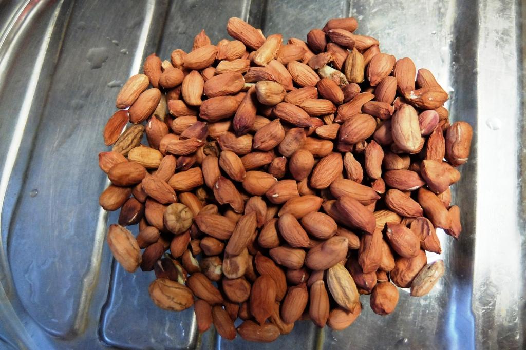 ①落花生をフライパンで乾煎りして少し焦げ目ができる程度。