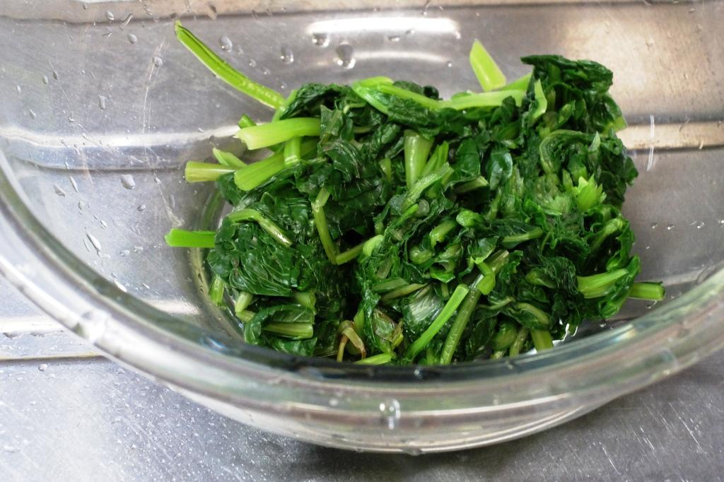 ④小松菜をうでてよく絞り3cmくらいにきる。
