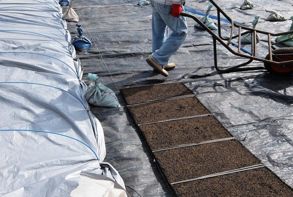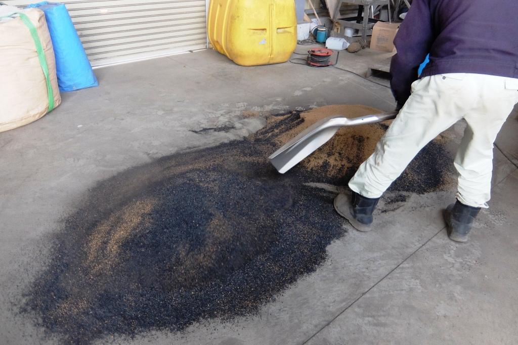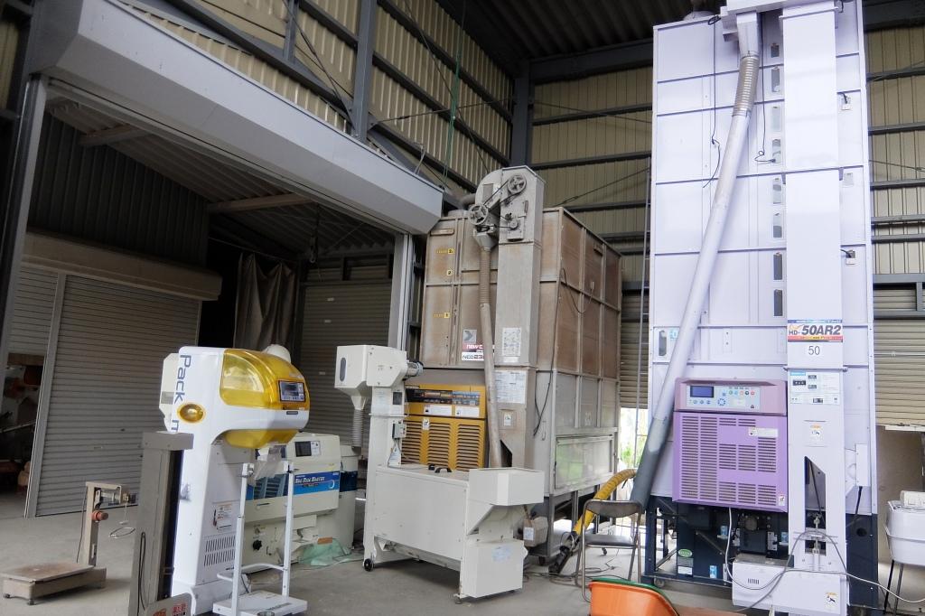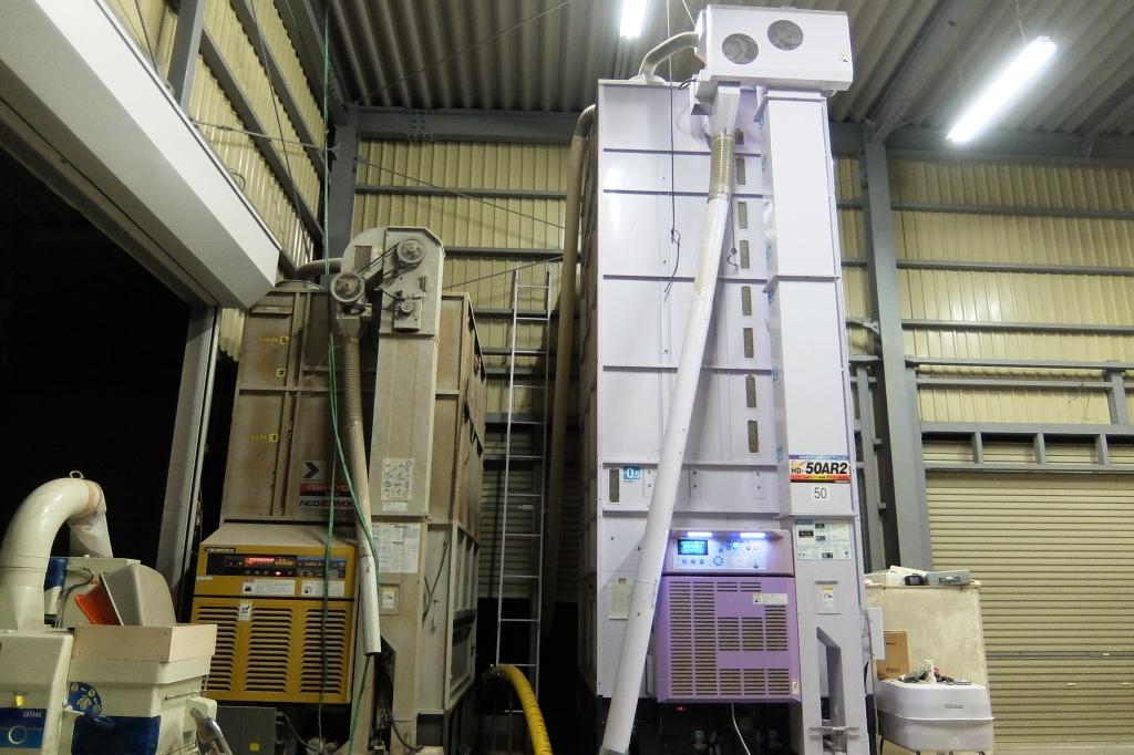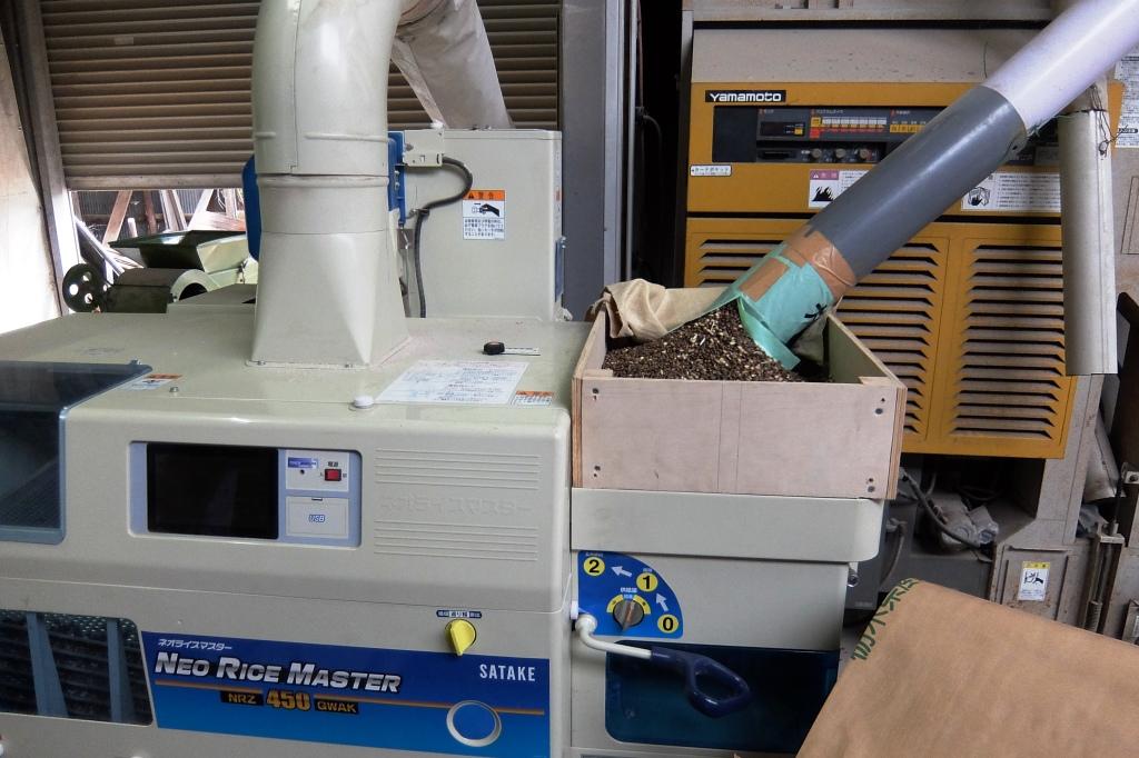 刈り取ったハトムギは乾燥機に入れて水分を調整する。