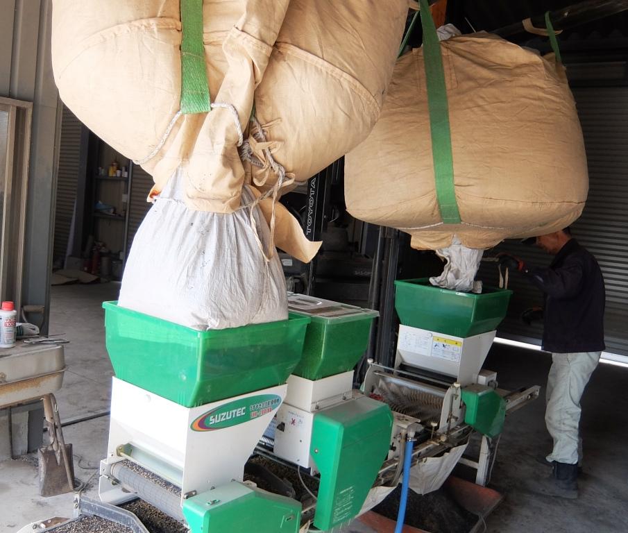 乾燥が終わると袋詰めを始める。水分計で15%以下を何度も作業中に確認する。
