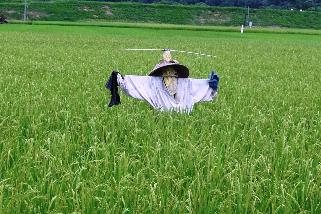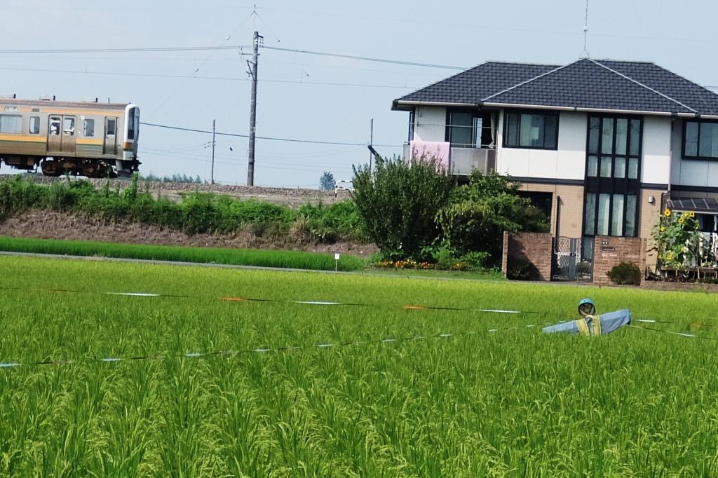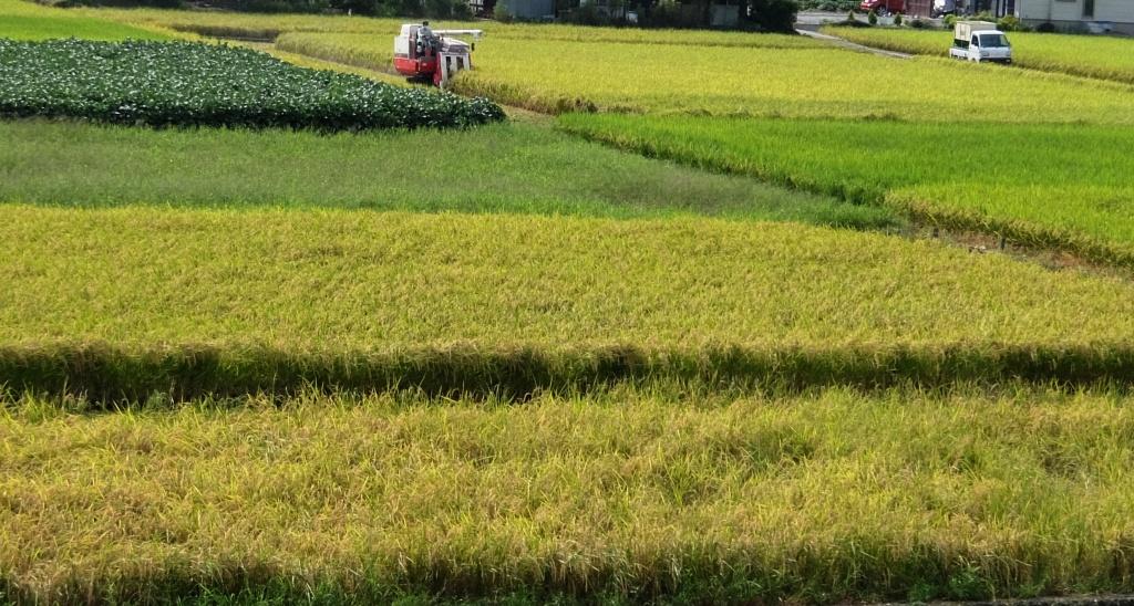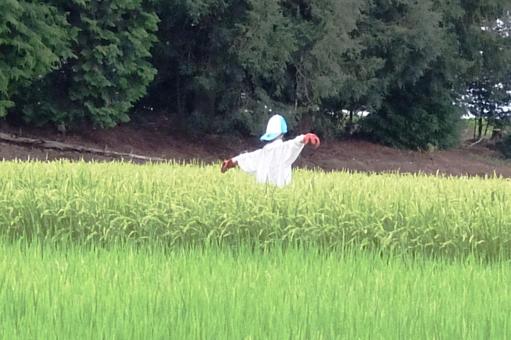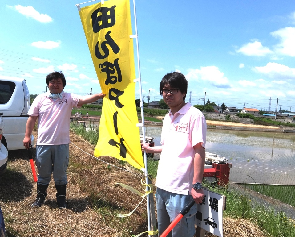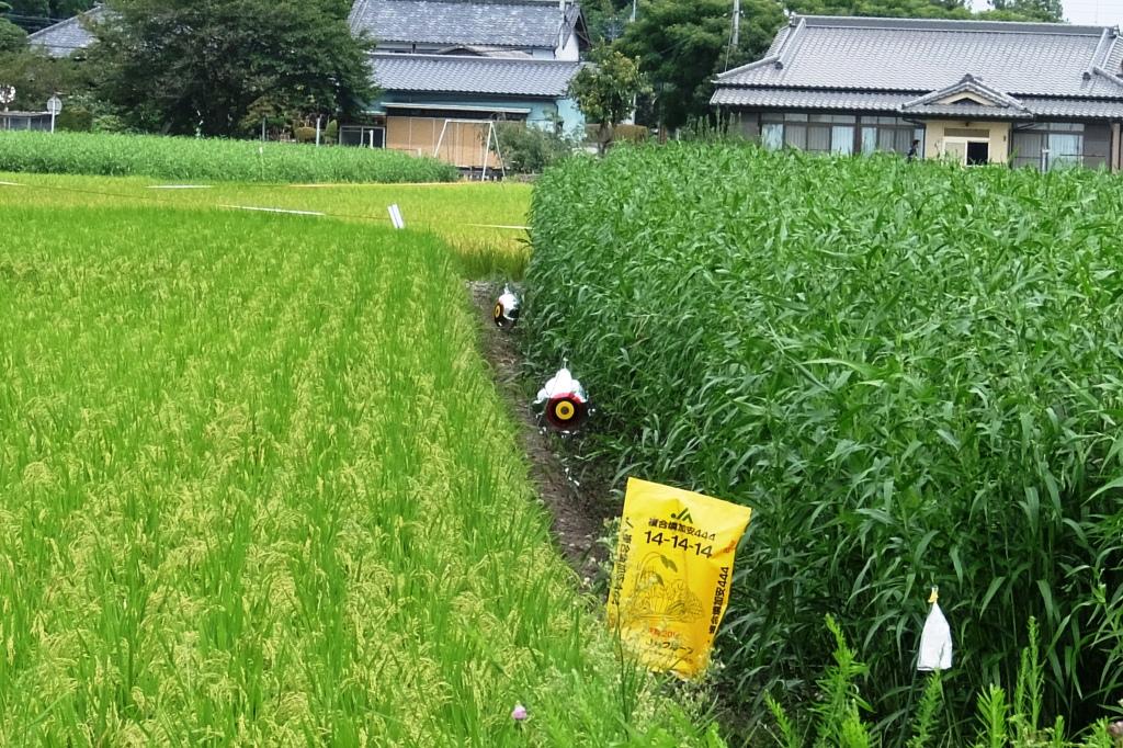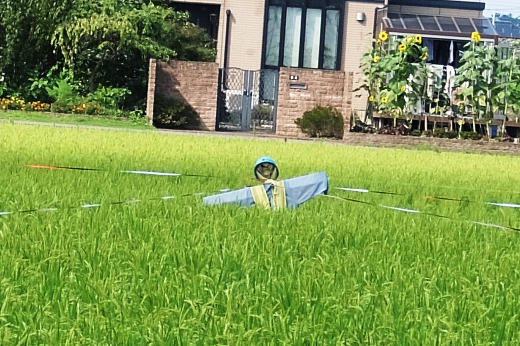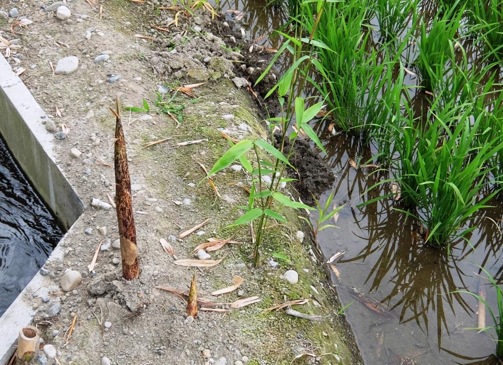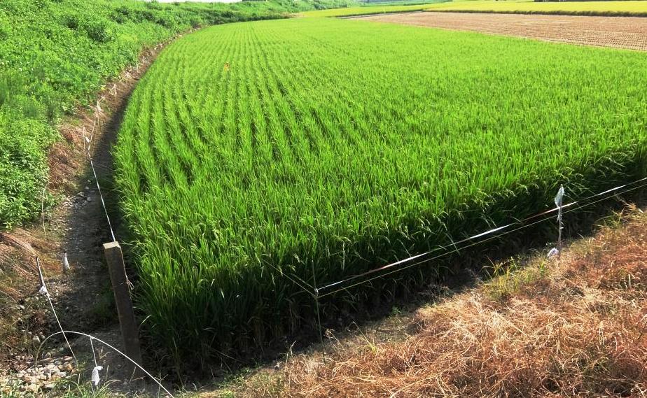 隣の田んぼは、イノシシ対策としてテープやメハジキで囲ったりしている。