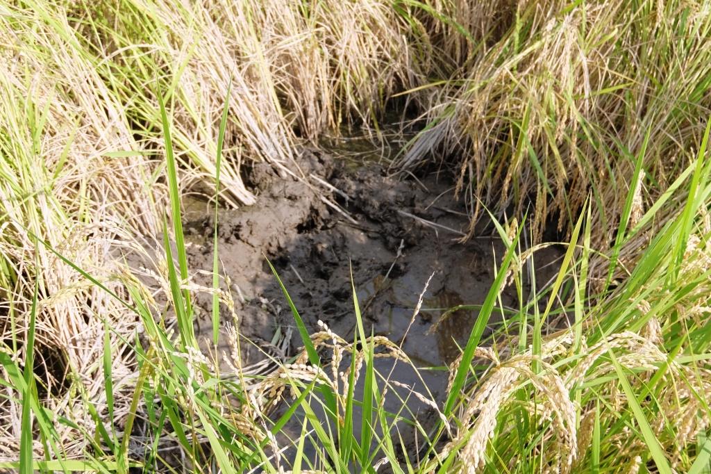 田んぼの中は何か所もイノシシの蒐場(ぬたば)になっている。