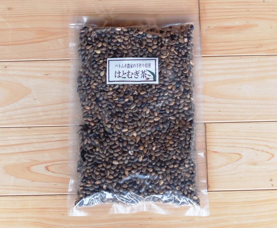 自家製焙煎のはとむぎ茶300g入りの袋詰め。