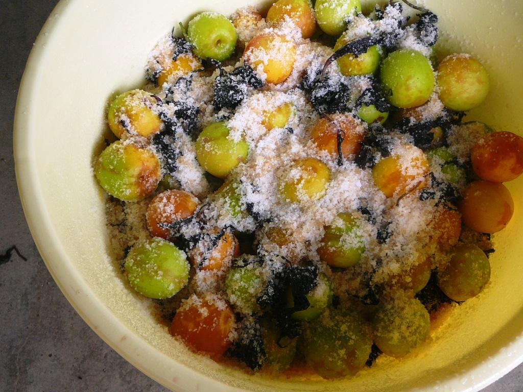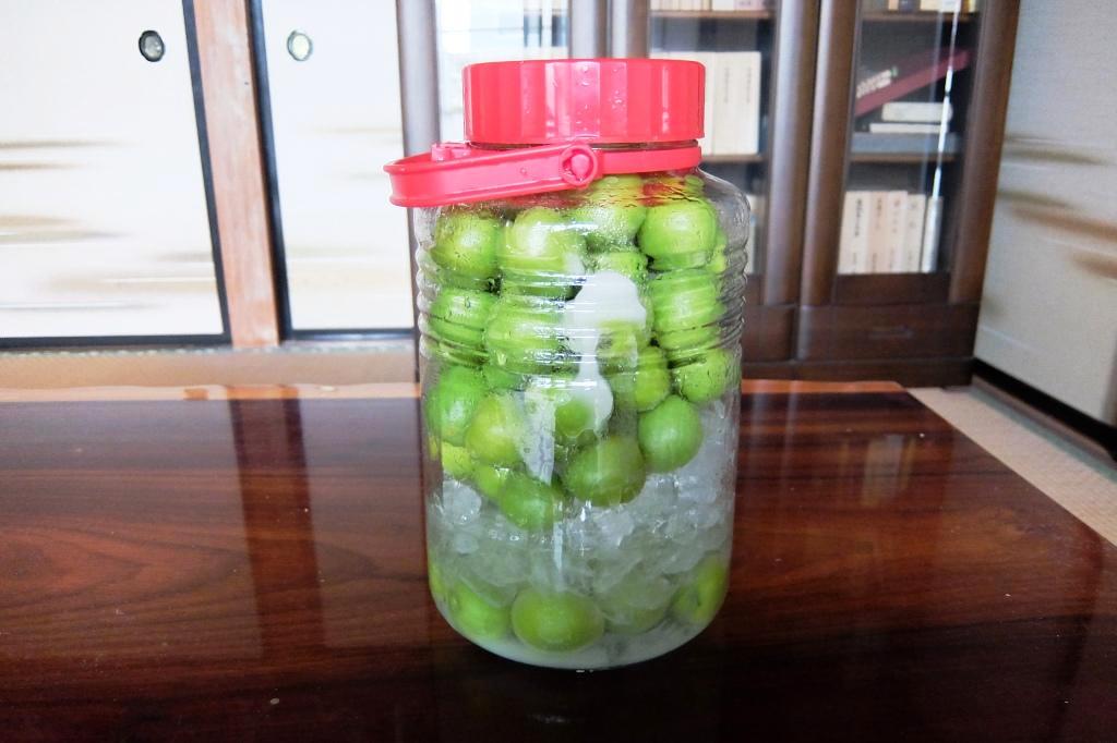 瓶に梅と砂糖と氷砂糖を交互に入れ最後に水を入れ良くなじませる。