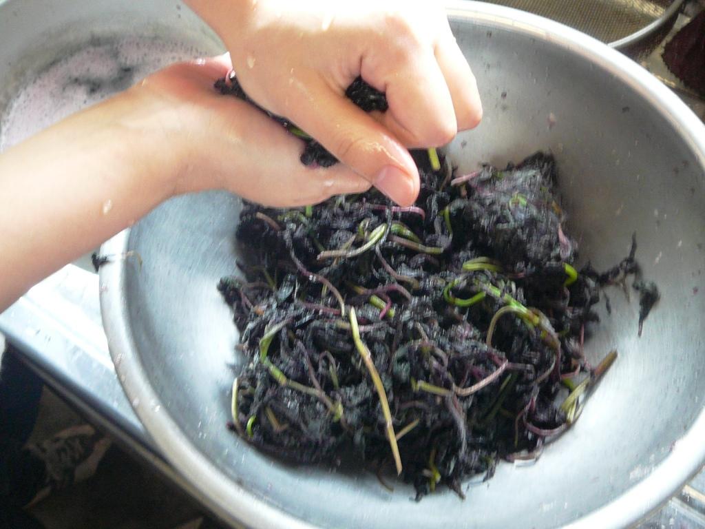 ②シソは500gの塩で良くも見込みアクをとってしんなりさせる。
