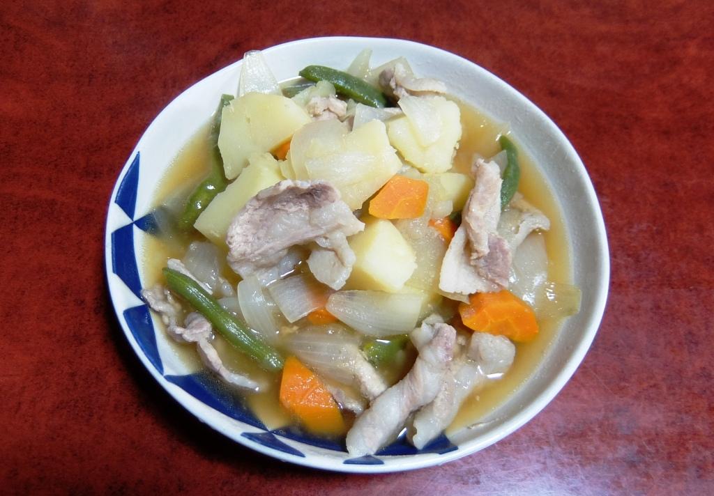 我が家でとれた野菜(玉ねぎ 人参 いんげん)と豚肉で作った肉じゃが