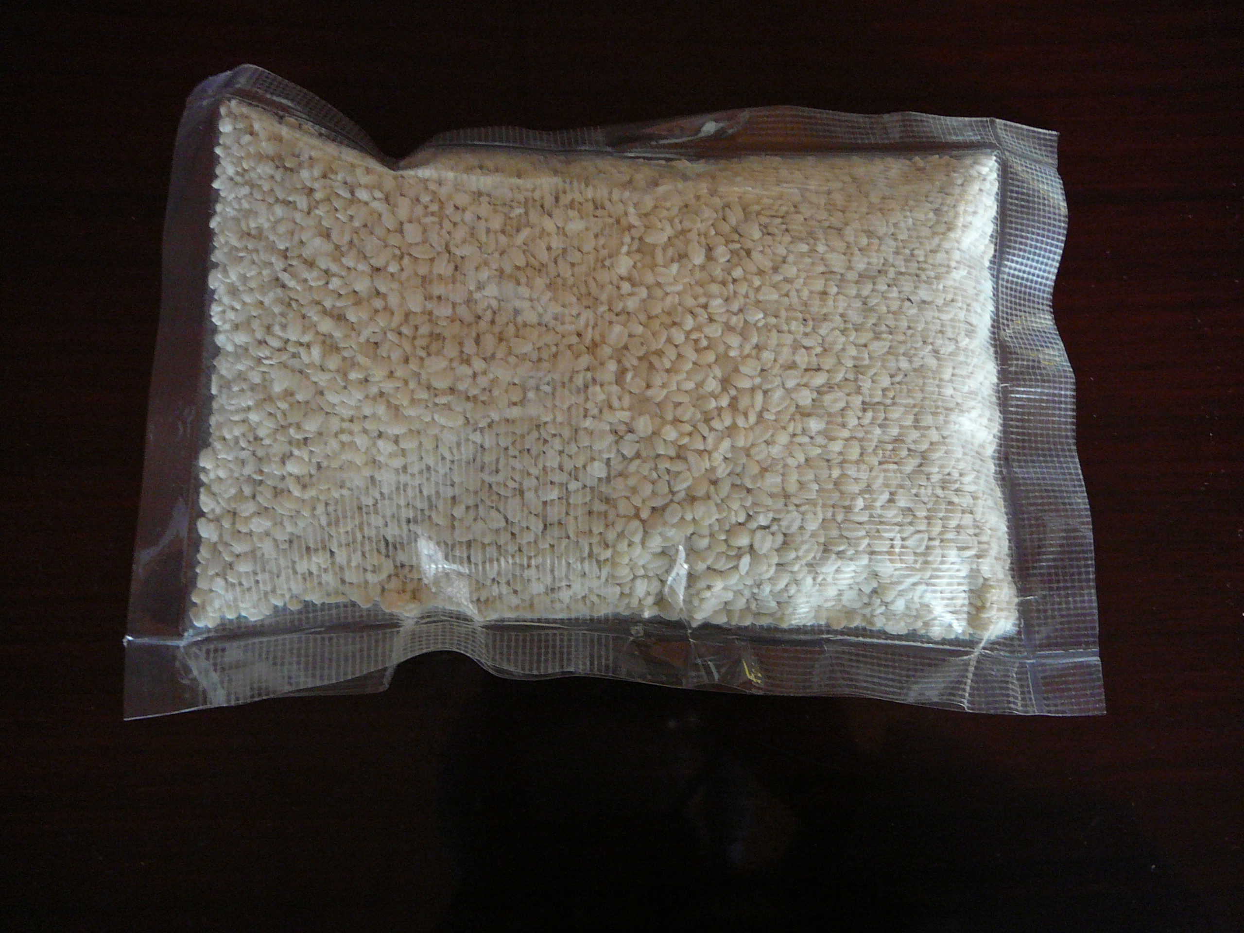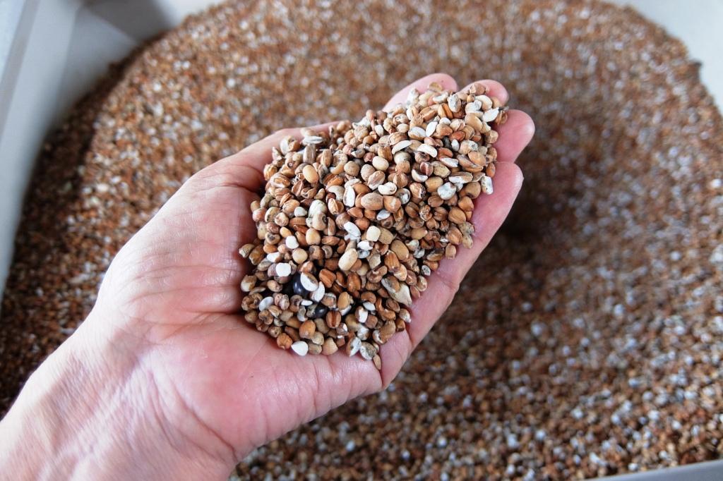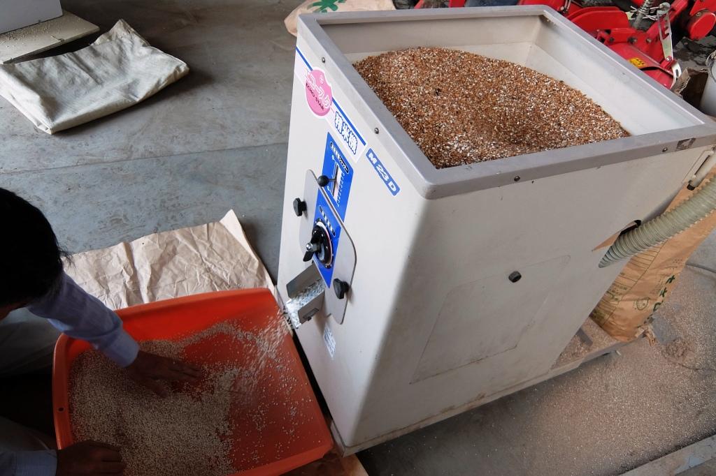 ハトムギの殻を取り除いたもの(脱穀ハトムギ)を精白機で精白する。