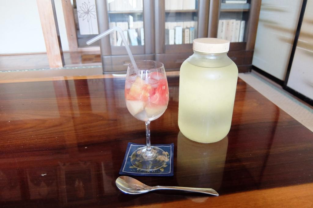 棒寒天が10本くらいある。沢山とれた梨、もう最後になってしまったスイカ、6月に作った桃の砂糖煮が冷蔵庫に保存してある。南高梅で作った梅はちみつジュースもある。