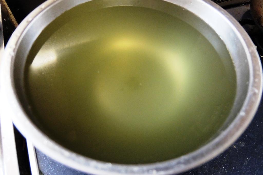 寒天1本を水で洗いちぎってなべに入れ沸騰させる。