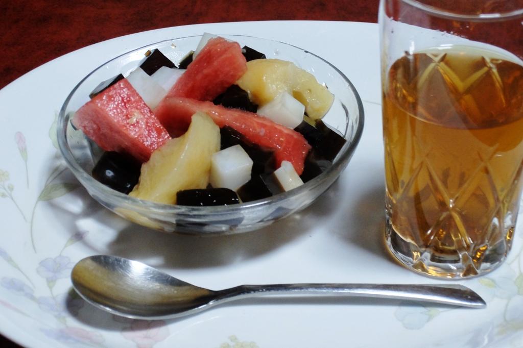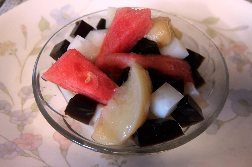 スイカと桃の砂糖煮と梨をトッピングして出来上がり。
