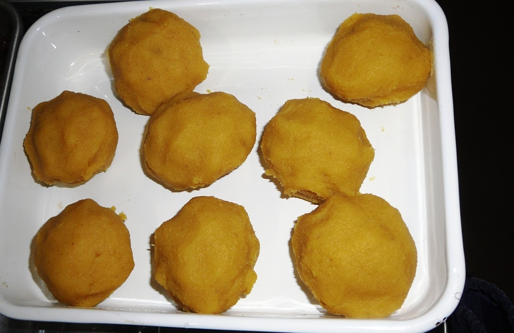 弱火で30分位(ほとんど砕いた形がなくなる)包丁で砕いた場合は40分位