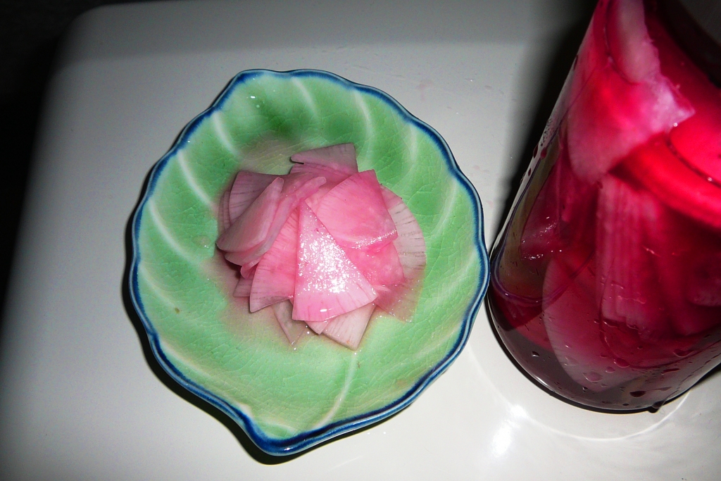 水で冷やして清潔な瓶に入れ酢、砂糖、塩を入れる。毎日良くかき混ぜる。