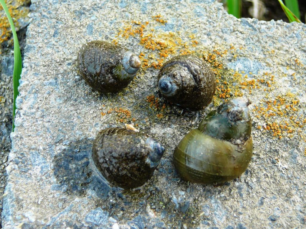 写真はタニシです。石ころのように田んぼの中に繁殖しています。