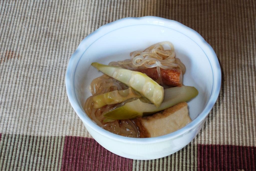 生揚げやシラタキと一緒に煮た。(醤油1、さけ1、みりん1、砂糖少1)