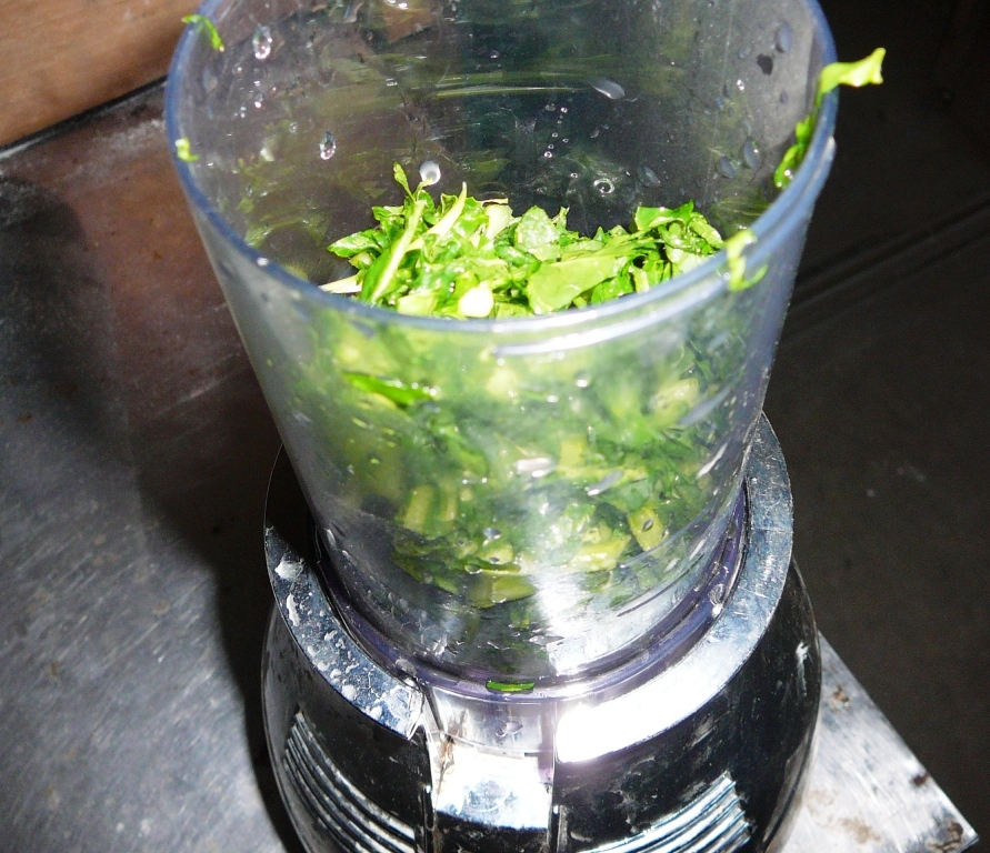 青菜を細かく刻んでミキサーに入れる。(写真はビタミン菜)