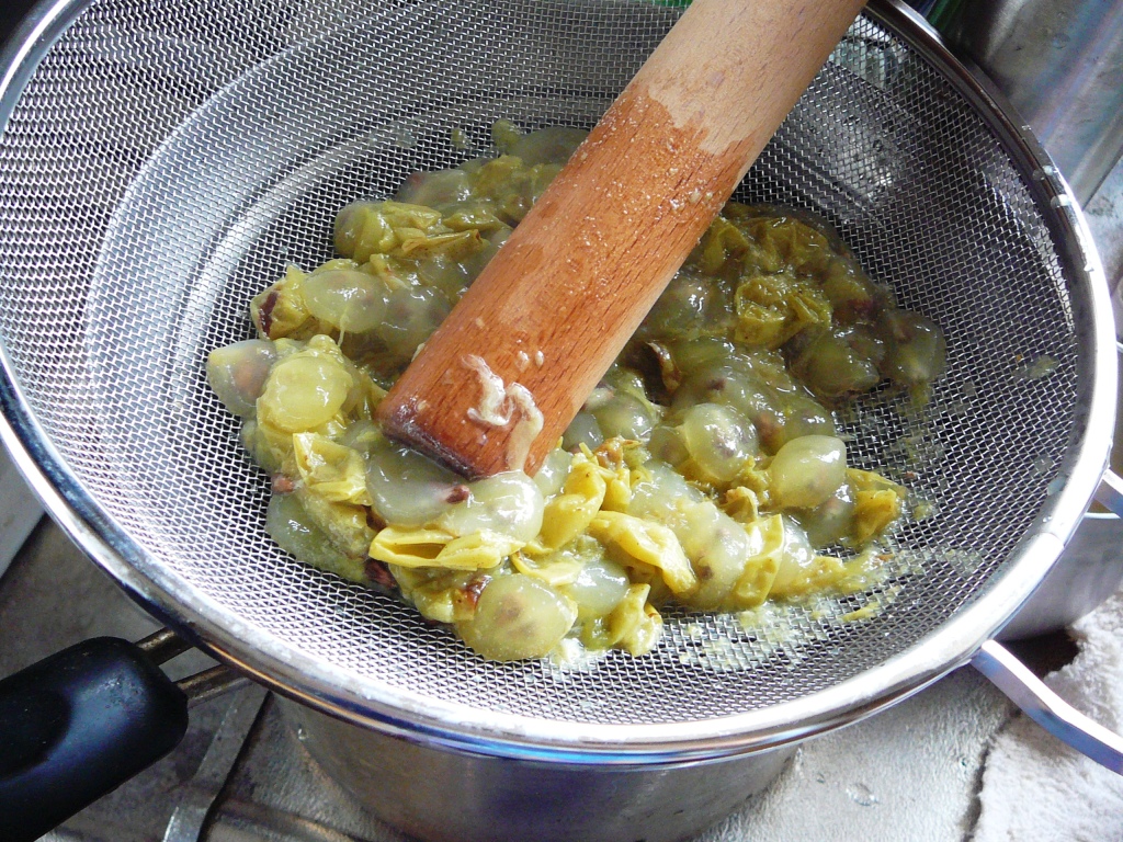 ④ざるに、煮たブドウをあけて、すりこ木で実をつぶして種だけをとる。