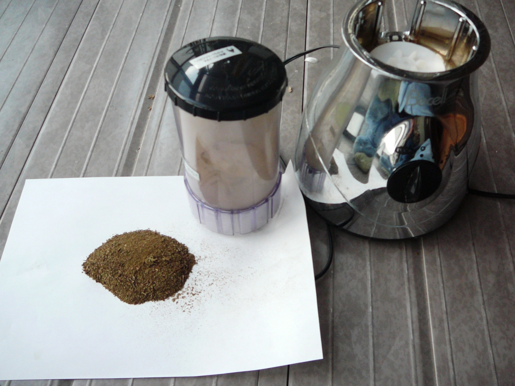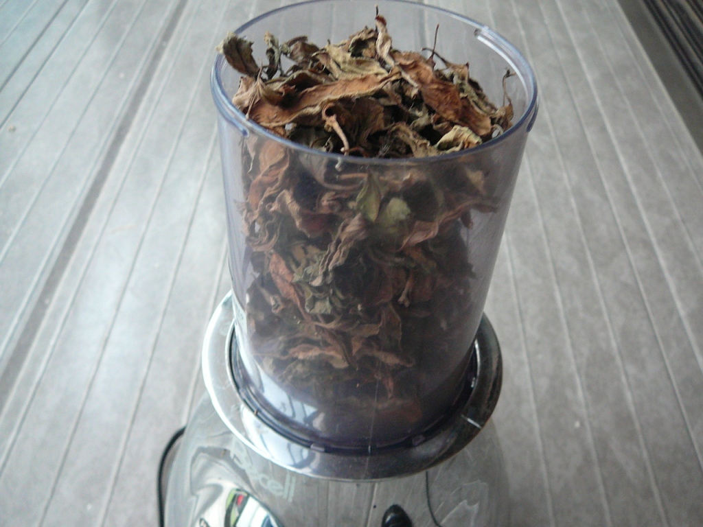 乾燥させた葉をミキサーですりつぶす。