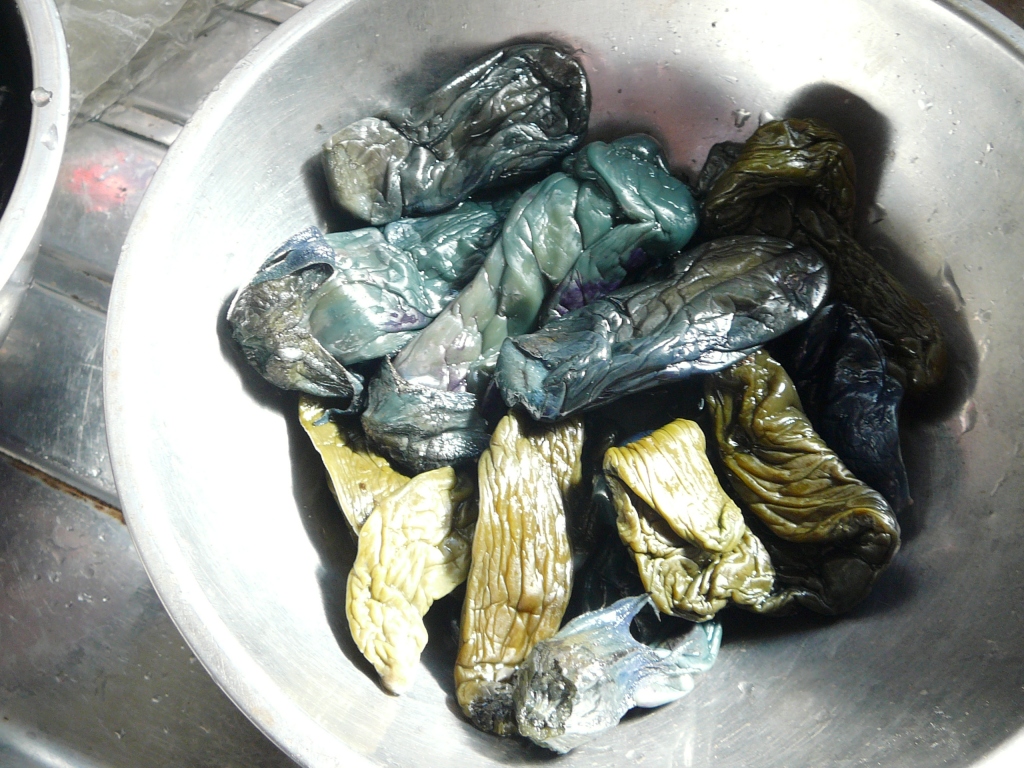 粉になった落花生に白魚と混ぜて、ゆでた大根の葉に乗せて出来上がり。