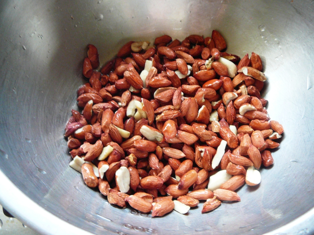 皮をむいた落花生をフライパンで乾煎りする。