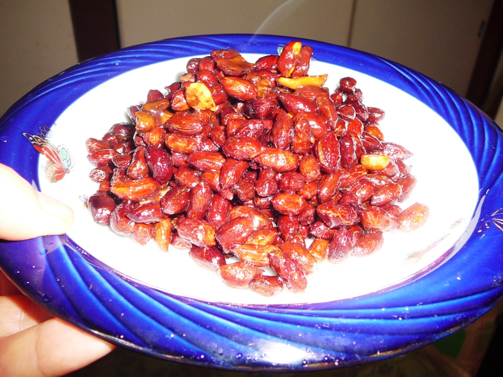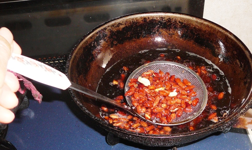 焦がさないように手早く、すぐに揚げたピーナツを入れてからめて出来上がり。