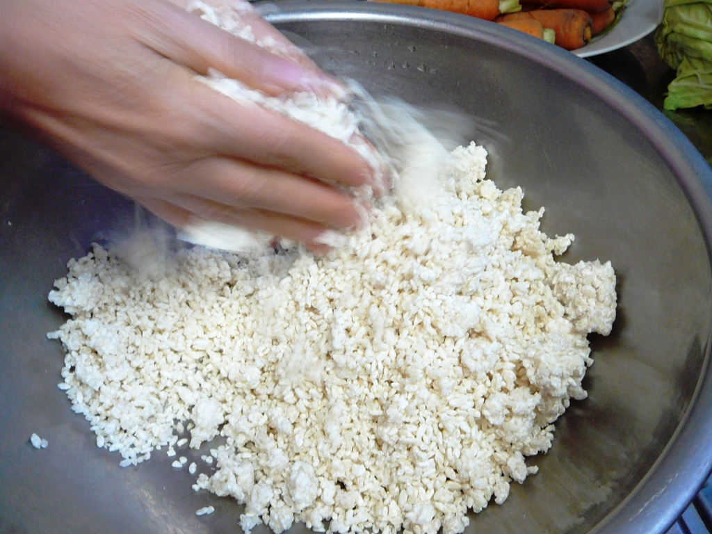 炊きあがったもち米にお湯(水でも良い)を入れ冷めたら麹を入れかき回す。