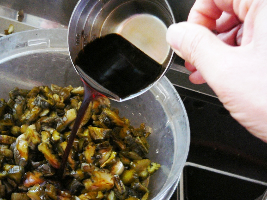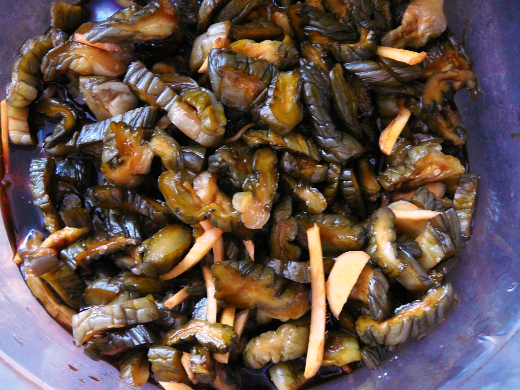 重石は重いほど良い。冬まで置くので水があがりうすいカビのようなものができるが差し支えない。醤油漬けするときよく、洗い流し3日くらい水を変えながら塩抜きをする。