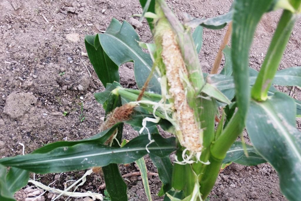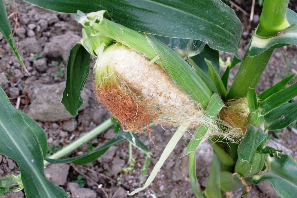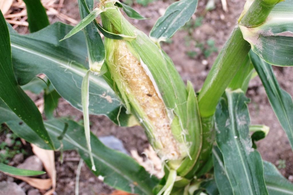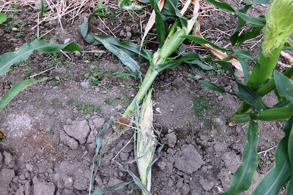 トウモロコシの皮をはいで食べたり、トウモロコシを倒して身を食べる。